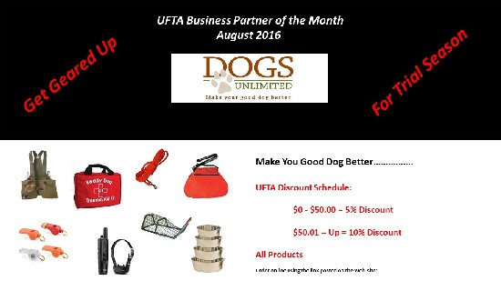 August is upon us and some of you will be running trials next month. Now is the time to get those items you need for the upcoming season and our friends at Dogs Unlimited are here to help. For the month of August, they are offering discounts for anyone ordering online from them by clicking through from the UFTA website. Click Here for larger image and discounts available. You must go to Dogs Unlimited from here to get the discount.
